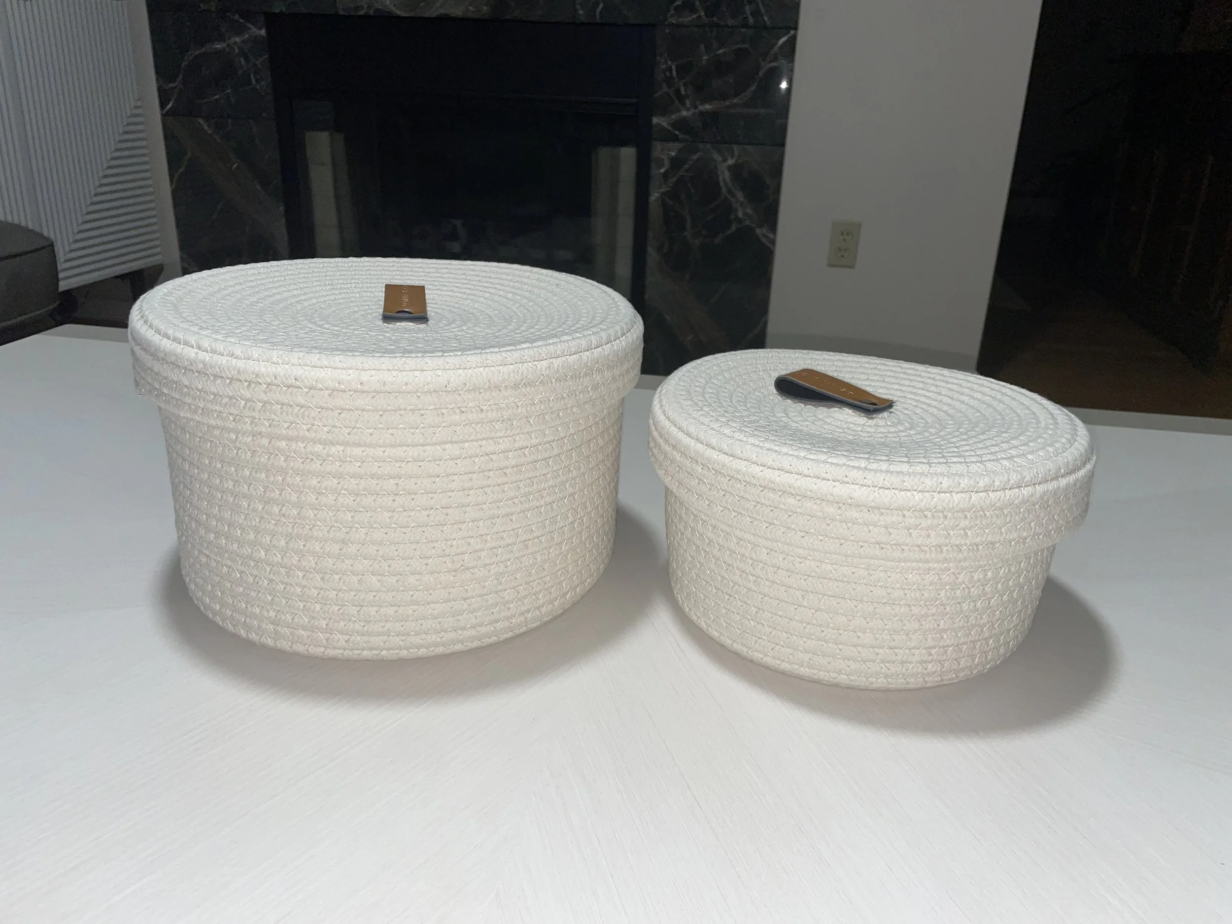 These rope baskets with lids are the perfect place to hide coasters and remotes. I love the cream color and little touch of leather handles. They look so much better on our coffee table than a tray or items strewn about.