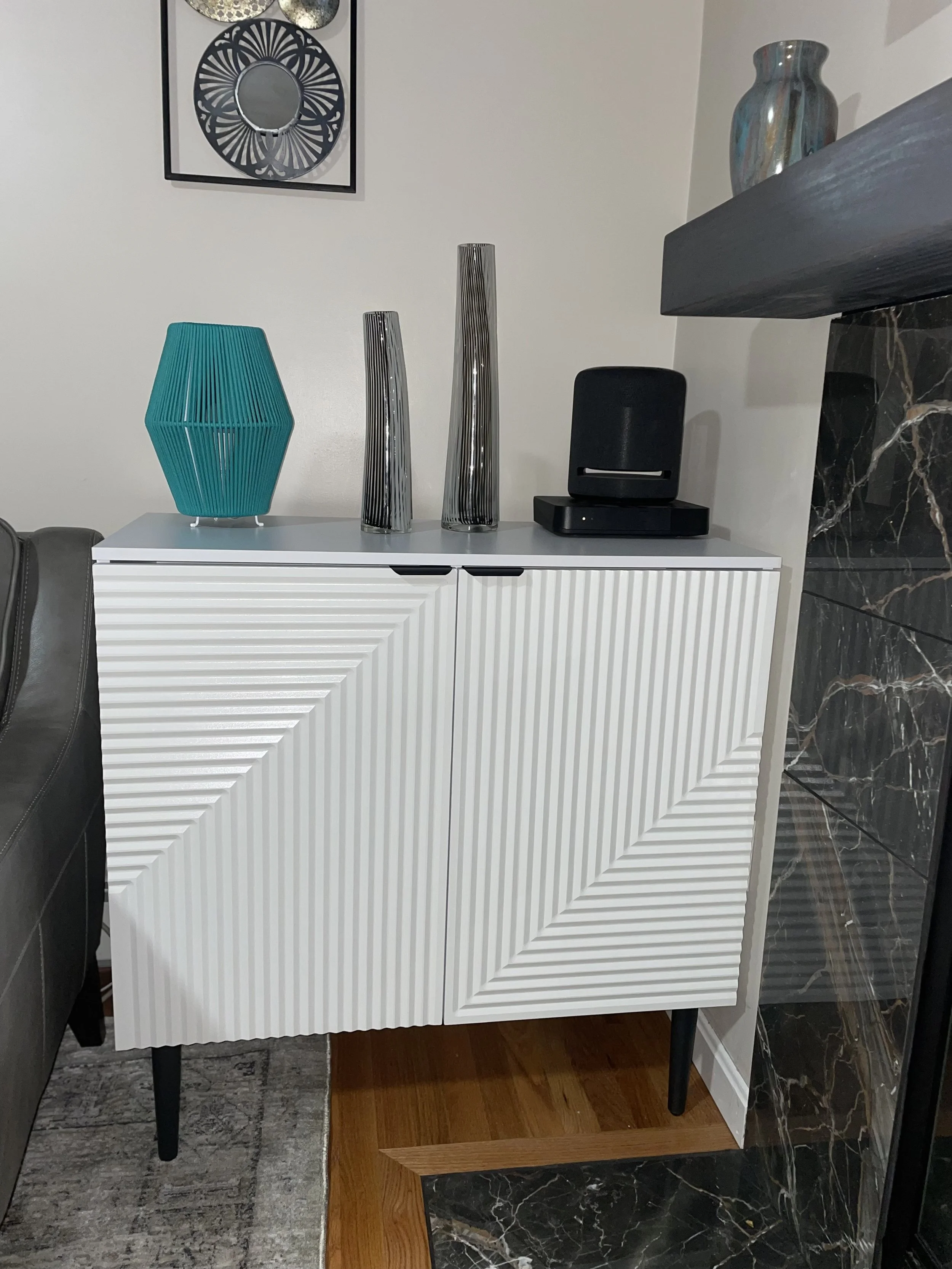 We love this modern storage cabinet. It is sleek, elegant and provides the functionality of storing (hiding) our cables, wires and other messy necessities we don’t like to look at.